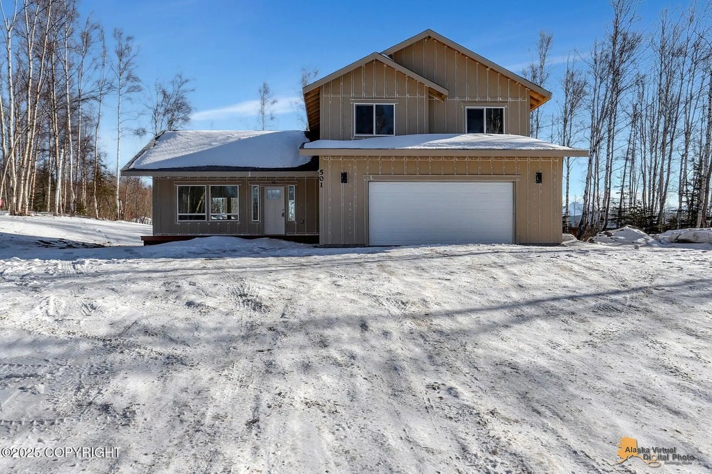 Beautiful 4-bedroom home just 7 minutes from downtown Wasilla—one of the few centrally located options on the market! This efficient layout offers versatility with a bedroom and full bathroom on the first floor, perfect as a convenient guest room or second master suite or a home office. Exterior features include board-and-batten siding, a covered entry porch, a covered back deck, and a paved driveway for great curb appeal. Inside, you'll find painted maple cabinets (light gray color), a modern backsplash, quartz countertops, a custom coffered ceiling in the master bedroom, a tiled master shower/soaker tub, and durable LVP flooring throughout the first floor. There's still time to personalize your finishes, including exterior colors, tile, lighting, and countertops. Estimated completion: 90-120 days. Photos similar and may include upgrades not included in this home.