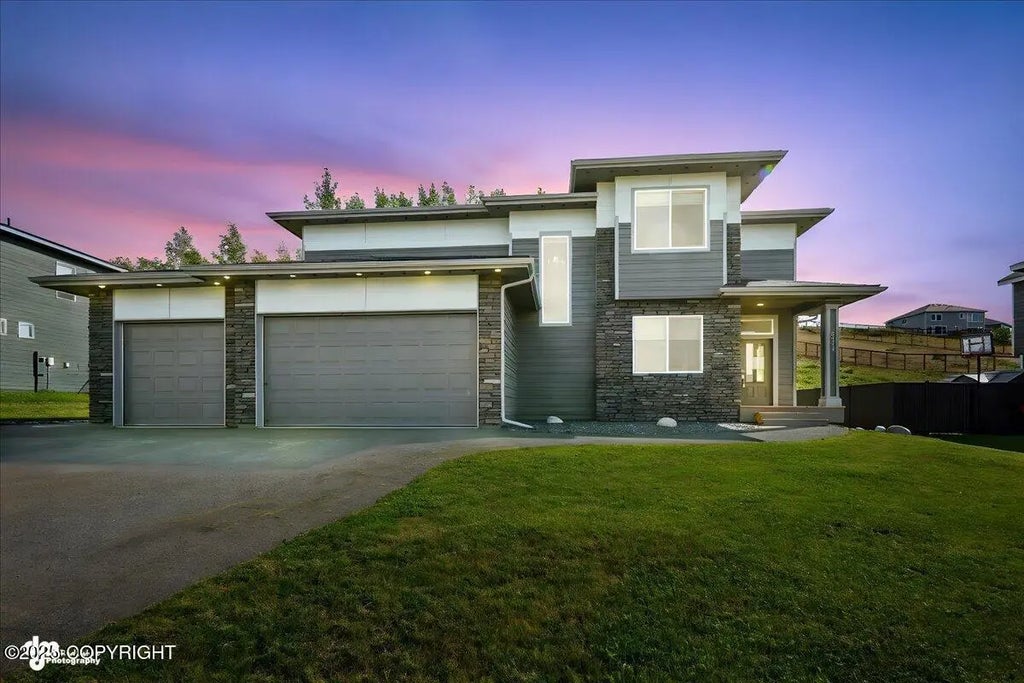 Open-concept design featuring cathedral ceilings and expansive windows flood the home with natural light, highlighting the spacious layout and creating an airy, open feel. Enjoy the convenience of electric blinds, allowing you to adjust light and privacy with the touch of a button. At the heart of the home is an open kitchen that flows seamlessly into the main living area, featuring... a massive quartz island with seating for many, making it ideal for both casual family meals and entertaining. Includes a roomy pantry for extra storage and prep space. This thoughtful floor plan offers incredible flexibility, with two bedrooms on the main floor. Upstairs are three additional bedrooms which include the primary ensuite. The ensuite bathroom is a private oasis, boasting a beautiful soaker slipper tub, the perfect spot to unwind after a long day. Garage features: utility sink and water softener/filtration. Outside, the backyard is an entertainer's delight. The patio area is perfectly positioned to take in the serene views, providing a wonderful space for outdoor dining, relaxing, and enjoying the scenery. Down the street there is a trailhead to Swan lake for birdwatching or kayaking. Great commute location: Close to medical, shopping, schools. Easy access to Hwy for those commuting to JBER.