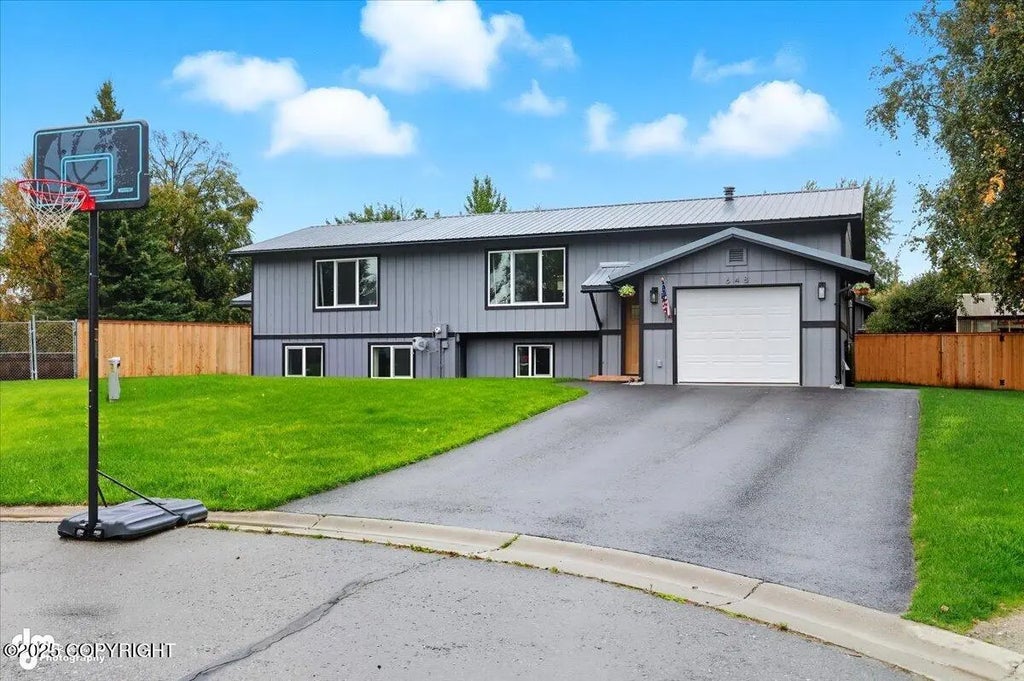 Set on a quiet cul-de-sac in the heart of Palmer with an easy Anchorage commute, this bright home brings mountain views front and back. Open kitchen with Formica Calacatta-look tops, soft-close island, waterproof LVP, and oversized owner's tub. Updates in '24-'25: all windows, carpet, driveway, fence, lawn, and exterior paint. Not in the boonies—just convenient! Interior Highlights: