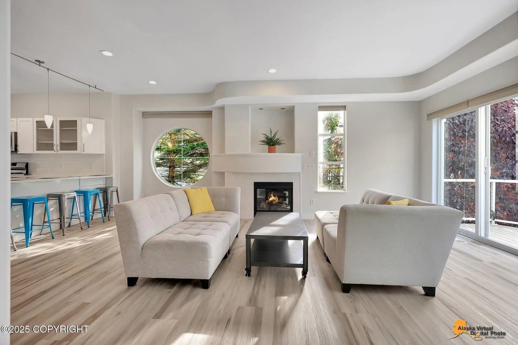 Open and bright main living area with an architecturally pleasing curved inverted ceiling design and an impressive south-facing wheel window that floods the room with natural light. Luxury vinyl plank flooring, a gas fireplace, and sliding doors that lead to a sunny deck perfect for outdoor relaxation.