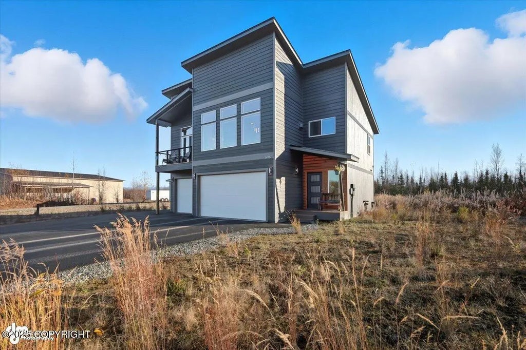 Between Beaver and Stepan Lakes, this striking modern home pairs comfort and views with real utility. Living is up, garage is on the main, and the flow feels just right. The open upper level welcomes you with 10-foot ceilings and broad northern windows. On clear nights, kill the lights and watch the aurora from the couch by a floor-to-ceiling stone framed gas fireplace. At the center, the functional and stylish kitchen features seating around the sharp quartz island, a large walk-in pantry, and a full stainless steel appliance suite, tastefully accented with a clean subway tile backsplash. Tuck away in the office nook, a convenient private space right off the main living area for those looking for focus. The primary bedroom opens to a private, northeast-facing deck with views of Matanuska Peak. The suite includes a walk-in closet with custom built-ins, a dual vanity, a spacious custom-tiled shower, and ambient tray lighting. The lower level is about capacity. A deep, 1,036-square-foot, three-car garage handles projects and gear with room to spare. Outside, an expansive, freshly paved driveway parks boats and RVs with ease and ties into a new paint-matched shed. Bonus features include high-efficiency on-demand hot water, an HRV, and a security system. Built with quality materials and skilled finish work, this home has been carefully maintained and still shows like new. Come see for yourself!
