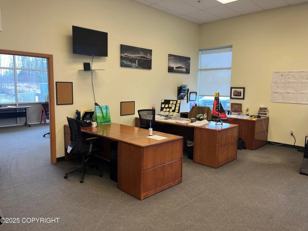 Great opportunity office/retail space available at the newest constructed building in the City Center Wasilla complex. Currently occupied as a real estate office, this space has a large open front room, laundry room, and a private corner conference room already built out. Plumbing is available in multiple locations for sinks, and could potentially have two restrooms. Tall 12' ceilings