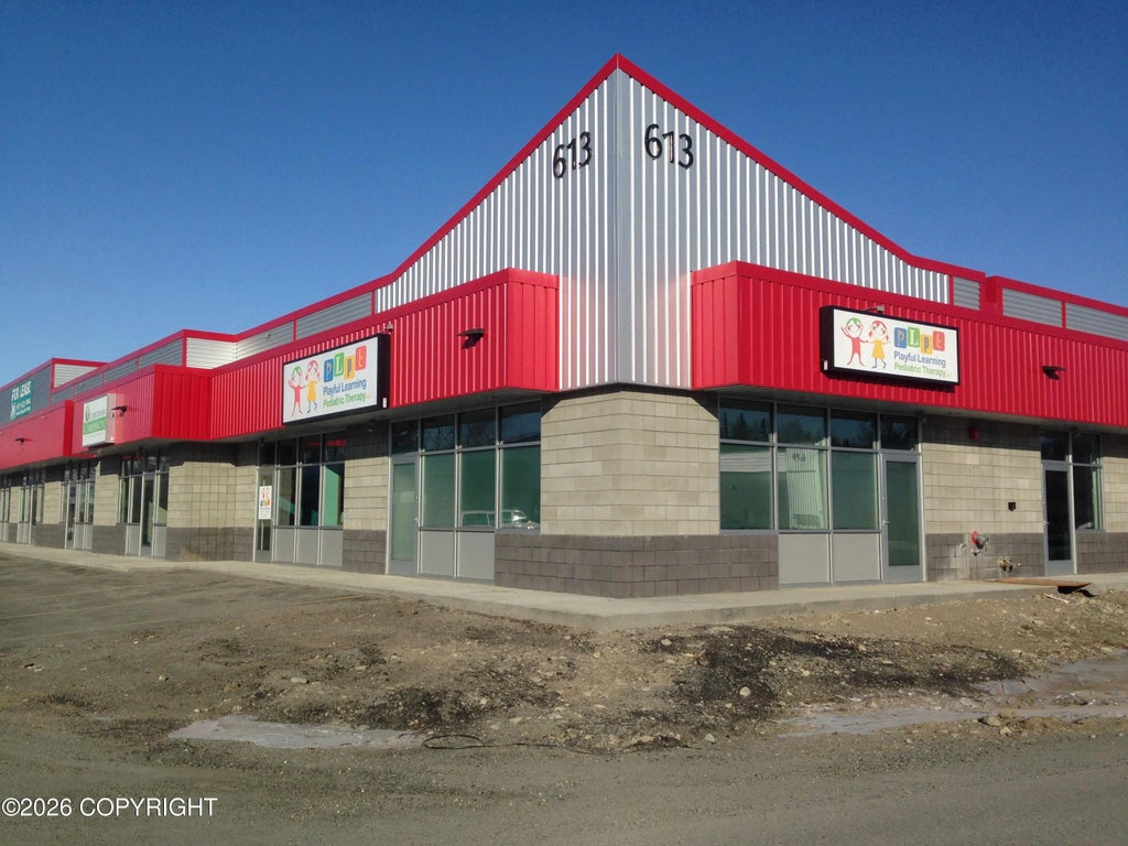 Great opportunity office/retail space available at the newest constructed building in the City Center Wasilla complex. Currently occupied as a real estate office, this space has a large open front room, laundry room, and a private corner conference room already built out. Plumbing is available in multiple locations for sinks, and could potentially have two restrooms. Tall 12' ceilings