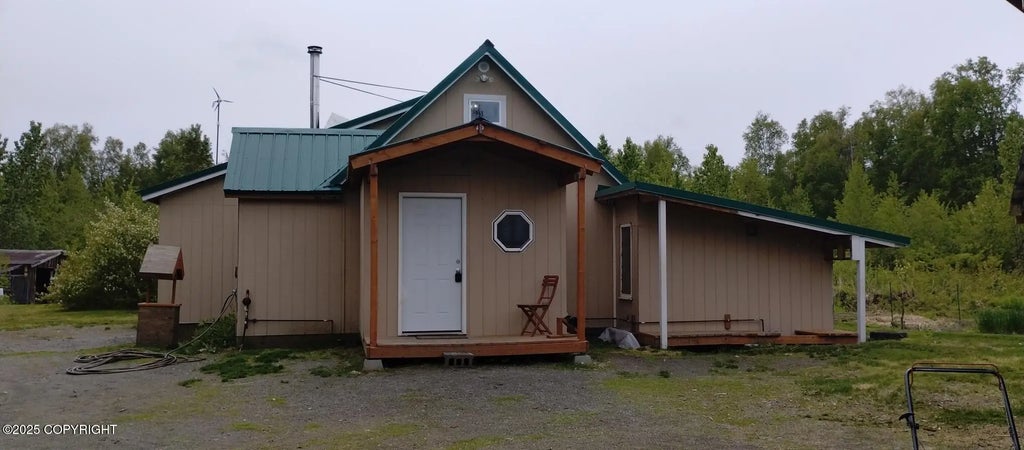 Off Grid living at its finest!Easy year-round access just off a maintained road. This home offers 3 bedrooms and 1 traditional bathroom and 1 dry bathroom, nestled on 2.75 acres. Complete energy independence with the included solar panels, inverter, maintenance free lithium batteries, generator, and windmill. The property is surrounded on two sides by undeveloped borough land giving you plenty of room to wander. The home has 2 propane heaters and a brand new Blaze King woodstove! Propane delivery is conveniently handled by Crowley, and the tank is currently filled. The home also boasts a new metal roof, a spacious sunroom perfect for enjoying the Alaskan light, and a fully functional kitchen. Water is supplied by a 40 ft gravel point well with a submersible pump and well as 28 ft sand point well with a hand pump, suitable for the kitchen, bathrooms, washing machine, and drinking. Please note that the property has a grey water drain system but no septic tank. The property also includes practical outbuildings such as a large fenced-in chicken coop and a connex container with covered additions on each side, offering ample space for tools and recreational equipment. There is a tilled 50X50 garden as well as a small pond! This property is being sold with everything you need to immediately embrace year-round off-grid living. It's conveniently located just a quarter of a mile off Susitna River Road, which is maintained by the Borough year-round. The access road, Trapline Rd, is maintained by the property owner. Property will qualify for a Uniquely Alaskan Loan, Recreation Loan or Cash Sale and is priced for a quick transaction. If you're seeking a move-in ready, off-grid Alaskan dream, this could be the perfect opportunity!