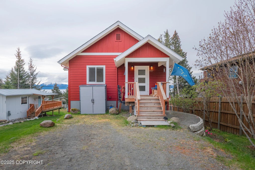 I am bigger on the inside than I appear! Almost 2,000 SF - Charming 3-bedroom, 2-bath home just minutes from the hospital, parks, and local restaurants. Built in 2013 and thoughtfully updated in 2023, this home blends modern style with a spacious, functional layout. Step into bright open entryway featuring two closets, perfect for storing all your Alaskan gear. The main level includes one bedroom, a full bath, and a bright, open-concept living, kitchen, and dining area. Large south-facing windows flood the space with natural light, and a deck off the dining area offers a great spot for evening grilling while taking in the view of Kachemak Bay and Mountains. Downstairs, enjoy a second living space complete with built-in shelving, a laundry room, two additional bedrooms, and another full bath. Solid, quality construction throughout, this home is move-in ready and made for comfort.