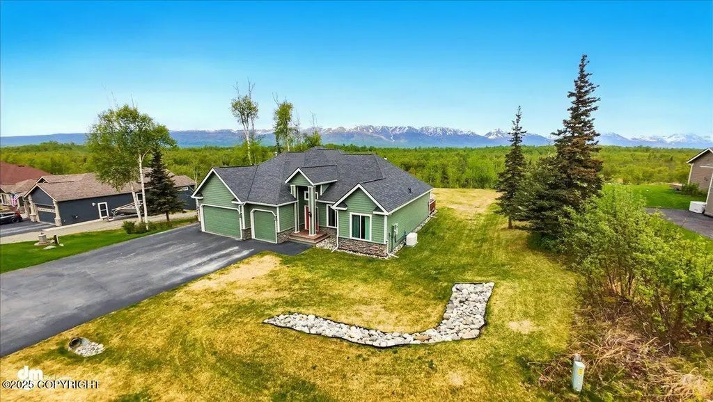 Beautiful open ''walk-thru'' ranch-style home on a bluff with views of the Talkeetna mtns and Hatcher's Pass. Gas FP with custom book shelving, custom tile throughout, rich maple cabinetry, granite countertops, stainless steel appliances. Large primary suite: vaulted ceilings, indirect lighting, huge bath w/ his & her sinks, corner jacuzzi tub, tiled walk-in shower. Large deck. Don't miss out!