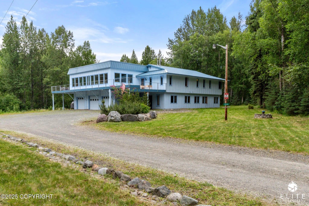 Peters Creek runs through this beautiful 2.5 acre property. The wrap around deck overlooks the river and the lush trees bordering the yard. The home's 5 beds and 5.5 baths along with two offices, a multipurpose room and den provide abundant space for family, work and play. Sounds of the river waft through the windows of the great room that runs the length of the house. Picture windows let in natural light and views of nature from all sides of the home. Enjoy views of the river from the great room or catch a glimpse of it from the library while picking a favorite read from the floor to ceiling built-in bookshelf. The versatile layout of the home has limitless potential. The lower level with its own outdoor access, two beds, two baths and the multipurpose room could easily create the needed space for multigenerational living or other! The huge three car garage is set up for a shop, complete with a ventilation system and a half bath so you don't have to track into the home. The home is nestled in a wooded area down a quiet road. The sounds of the river and the occasional bush plane are the soundtrack for the family living here. A hill and trees protect the property from highway noise, in spite of its closeness and ease of access. Schedule a showing to see this beautiful property!