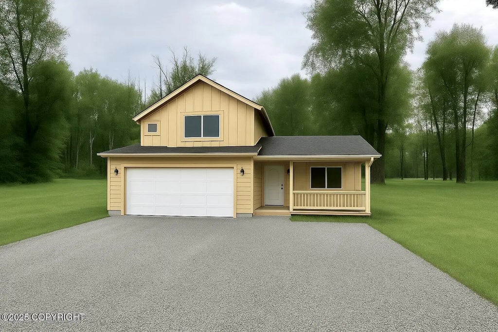 Discover this custom 1789sf new construction home set on a pristine 1.42 acre lot. Step inside to an inviting open-concept design featuring vaulted ceilings, luxury vinyl plank flooring throughout & a cozy gas fireplace perfect for Alaska's seasons. The chef-inspired kitchen shines with quartz countertops, a large center island & sleek cabinetry. The main-floor primary suite is a private retreat. The primary suite offers a walk-in closet with organizers, a double vanity & a beautifully tiled shower. Upstairs, a versatile family room provides extra space for entertaining or relaxing. This thoughtfully designed home offers the perfect balance of comfort & contemporary elegance. Outside enjoy seamless gutters, metal roof accents, composite decks & a wide driveway. All of this sits on a private corner lot in a newly developed subdivision only minutes to Soldotna's City Center. Home is in construction phase and should be completed end of January 2026.