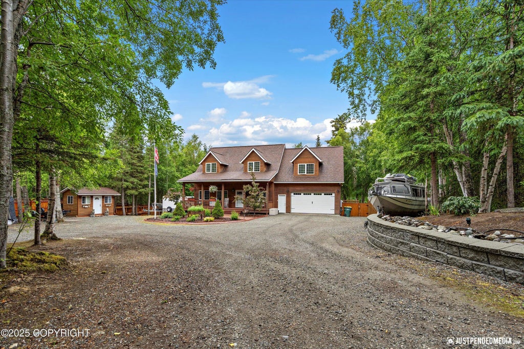 This must-see Alaska custom-built home boasts 1+ acre, cedar siding, and dormers. In-floor heat is on all three levels, including the garage. The main level is finished with lovely slate tile throughout, an open kitchen to living-room w/corner gas fireplace, hickory cabinets, granite counter tops,seperate formal dining area for entertaining. 3 bedrooms on top and a full basement for guests use. a corner gas fireplace, hickory cabinets, granite countertops, high-end appliances upgraded in 2024, a full bath, laundry room, and separate formal dining area for entertaining. The upper level has three bedrooms, a full bath with soaking tub and walk-in shower, a quiet reading area, and lots of storage. The primary bedroom is extra-large with his and her (walk-in) closets. The full basement offers a family room, bar or workout area, full bath, built-in bookshelves, and a bonus room. An exit door downstairs leads to the backyard. This is all on a level lot with a gorgeous backyard surrounded with 6-foot privacy cedar fence and gate access on both sides of the house and tons of space for RV, boat, etc. in the front. The setting is picture-perfect and a must-see Alaska beauty. You will enjoy a park-like setting in the spacious backyard with lots of room for the kids to play, pups to explore, and the gardener of the family to get into the dirt. It feels like remote privacy yet it's only 3 miles to the grocery store!