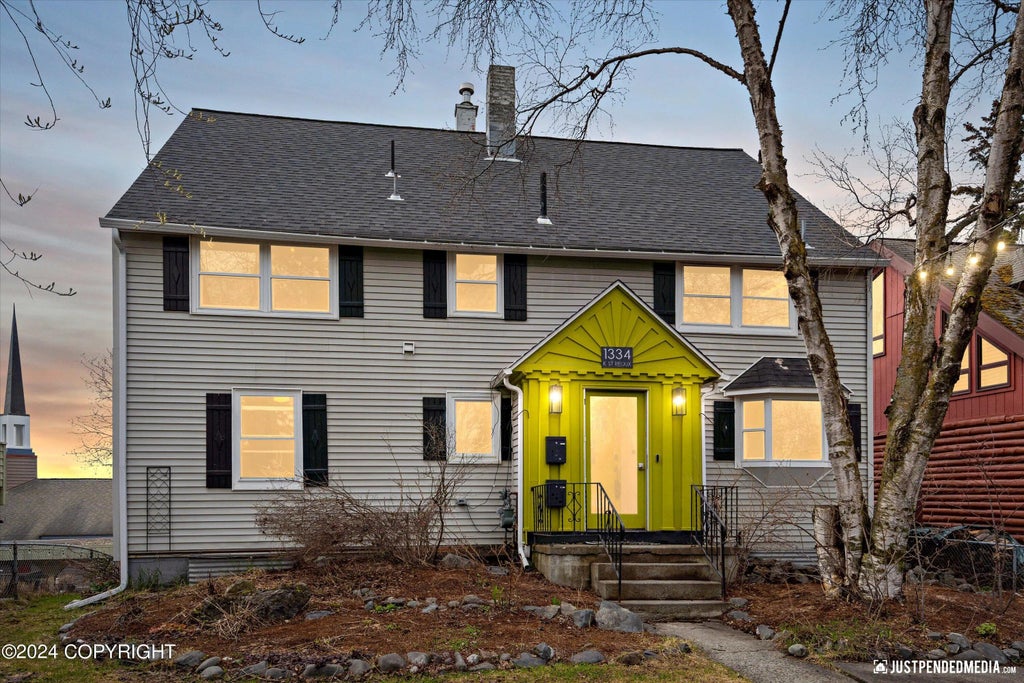 Welcome to this charming 1949 downtown Anchorage home, where timeless character meets modern comfort. Ideally located a short distance from the city market, Westchester Lagoon, and the vibrant downtown scene, this property offers the perfect balance of convenience and classic appeal. A versatile in-law apartment provides a private one-bedroom space with both shared and separate entrances—ideal for guests, extended family, or rental income potential. The main home features a thoughtful layout with a main-floor office/bedroom and half bath, plus three spacious upstairs bedrooms, each with its own ensuite bath for privacy and comfort. The finished basement includes a large pantry and media room, adding even more living flexibility. A rare downtown find, the two-car garage offers secure parking and additional storage, complemented by a private driveway and ample street parking. Outdoor living is at its best with a southwest-facing deck, perfect for summer gatherings, while the heated sunroom lets you enjoy Alaska's sunshine year-round. Recent appraisal 04/25 at $950,000!